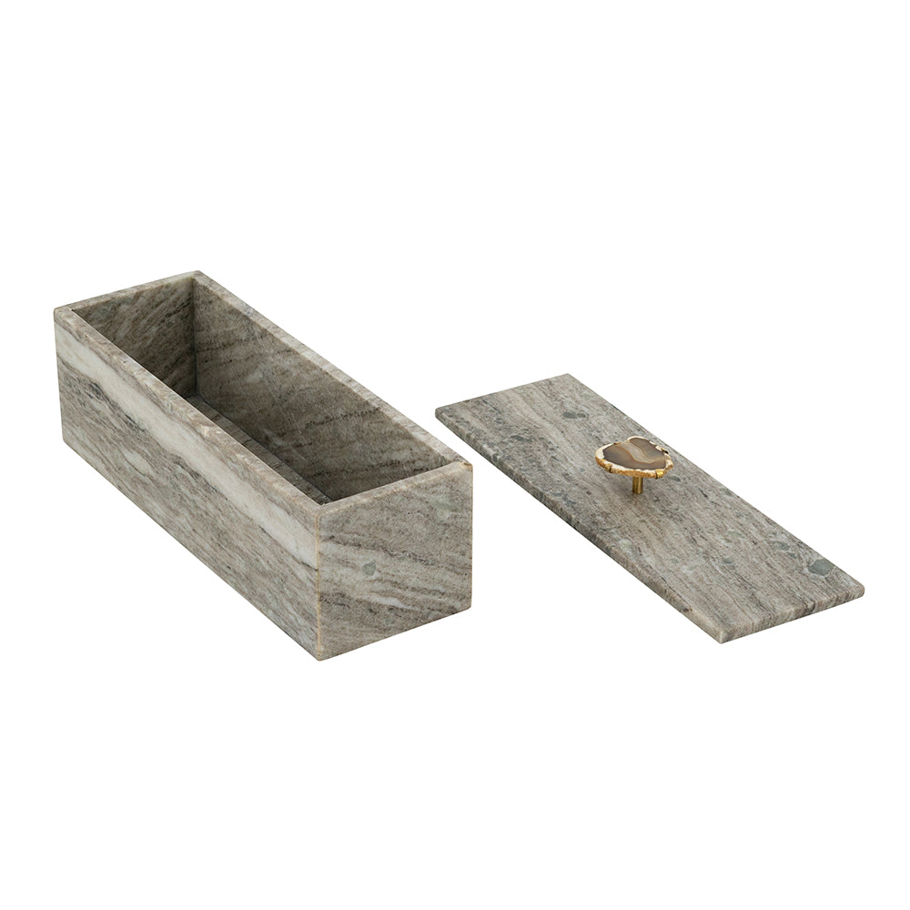 This decorative storage box features a sleek rectangular silhouette, a natural gray finish, and a brass knob adorned with a small agate accent. Whether used to hold trinkets, household essentials, or jewelry, it will seamlessly elevate the decor in your living room, entryway, bedroom, or office.